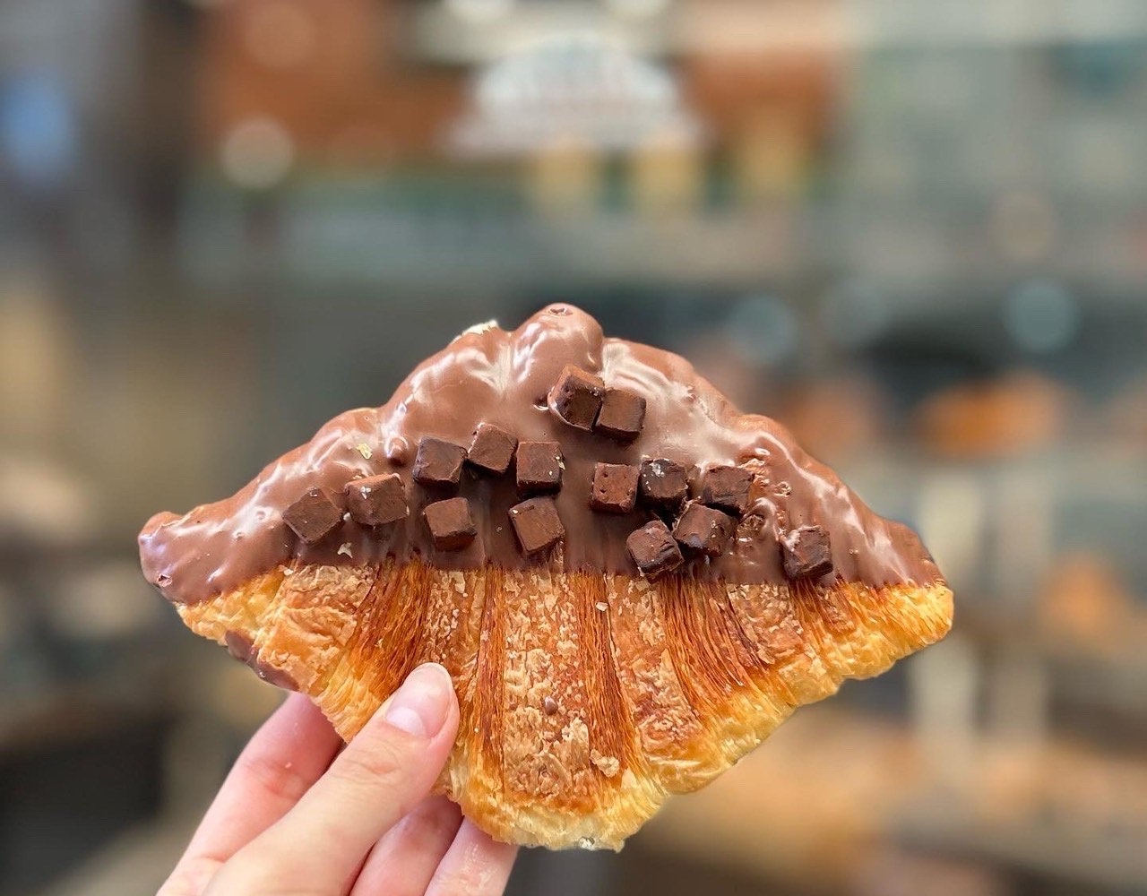 自慢のクロワッサンをプレスして焼き上げたぺったんこ。ミルクチョコ×濃厚なキューブチョコを散りばめたチョコ好きにはたまらないぺったんこクロワッサンをぜひ!