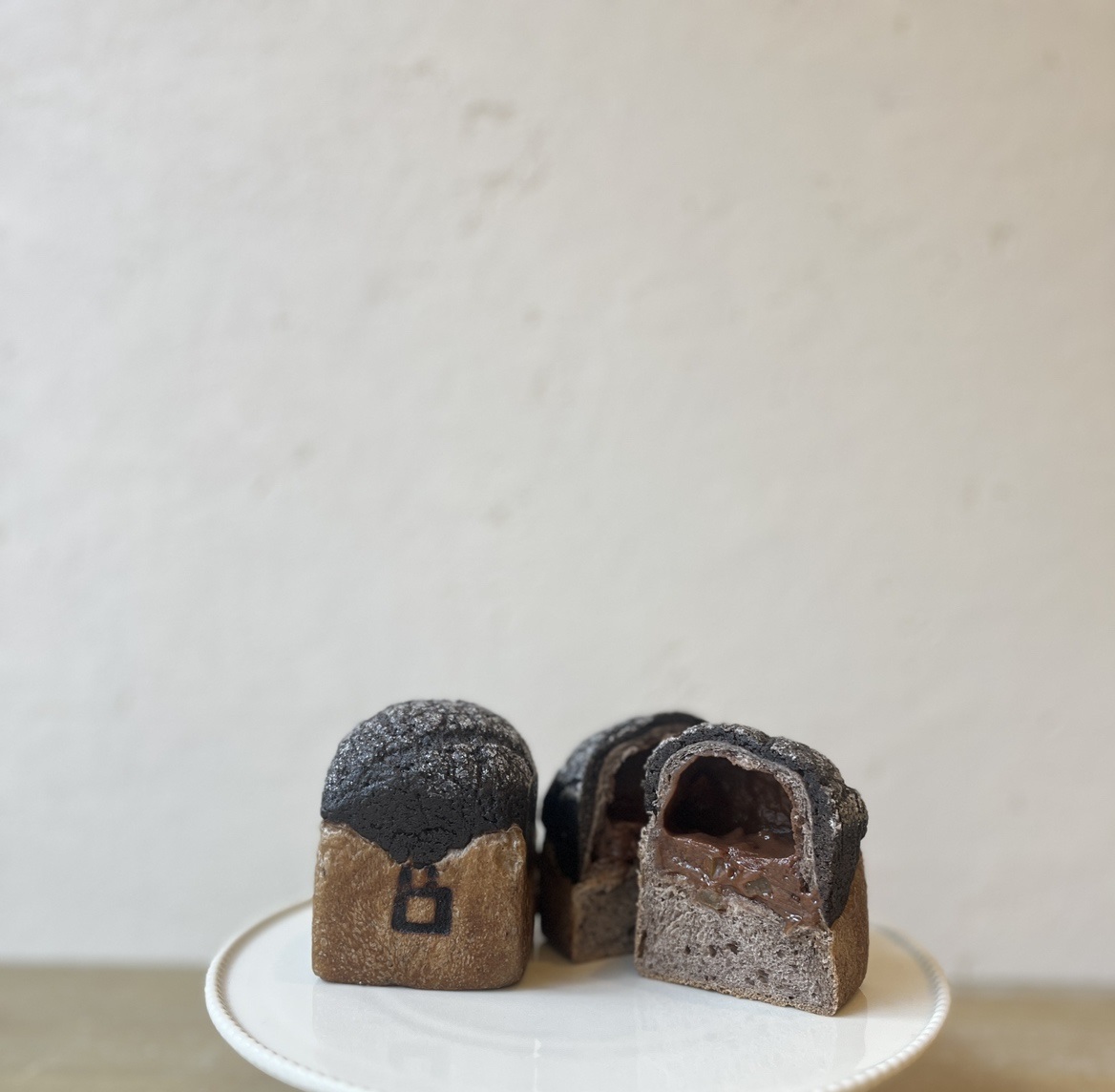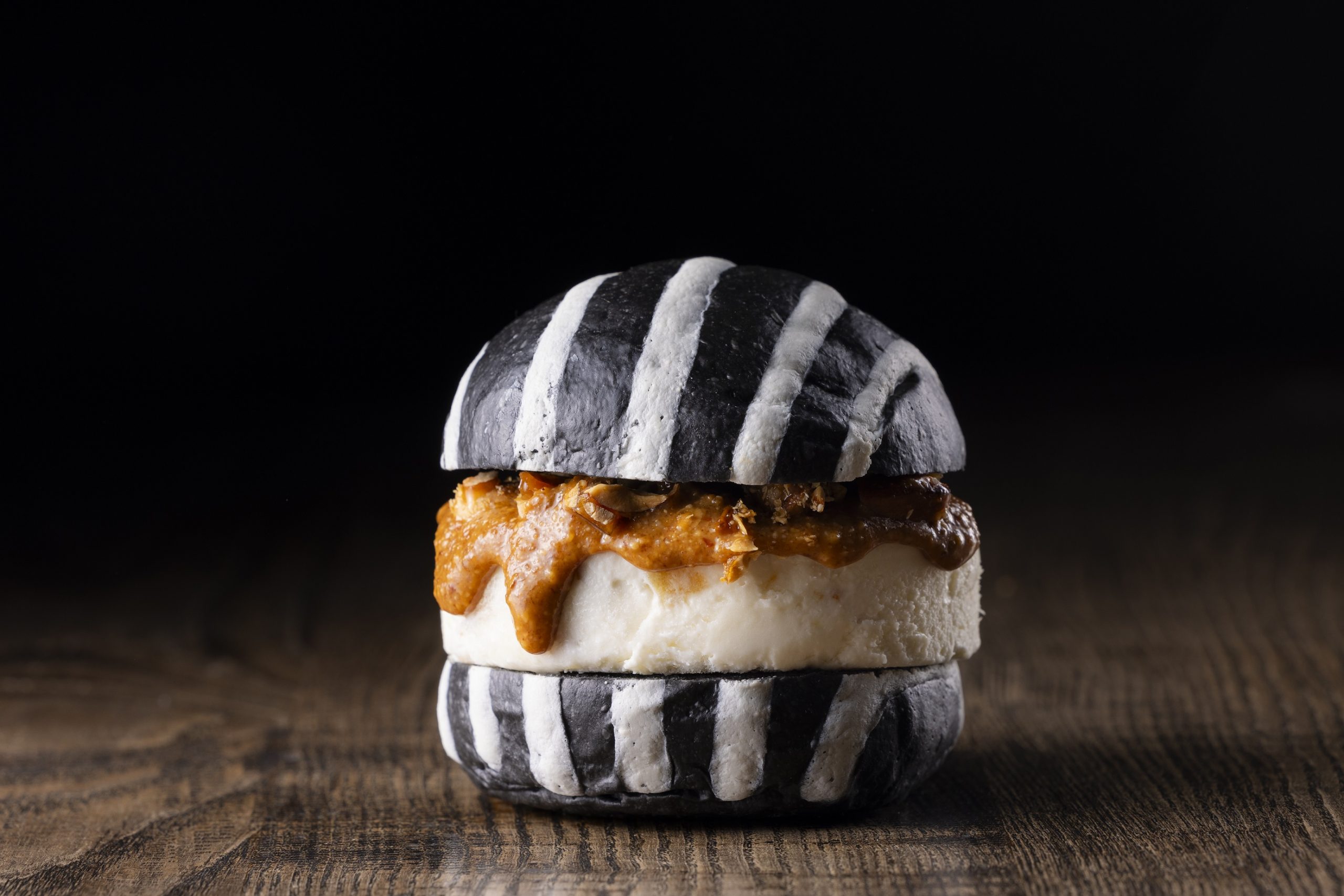 竹炭を練り込んだ黒白ストライプのモード系バンズ。ほろ苦いレモンピール香るクリームチーズに、香ばしいキャラメリゼナッツのプラリネ。ひと口で広がるのは、赤レンガの午後に忘れられない“静かな衝撃”。新たなパンのカタチです。