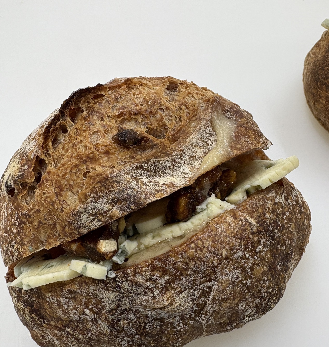 当店自慢の高加水ハード系の胡桃パンに、香り高いブルーチーズと蜂蜜を贅沢に挟みブラックペッパーでキリッと仕上げました。素朴な胡桃パンとの相性をお楽しみください。