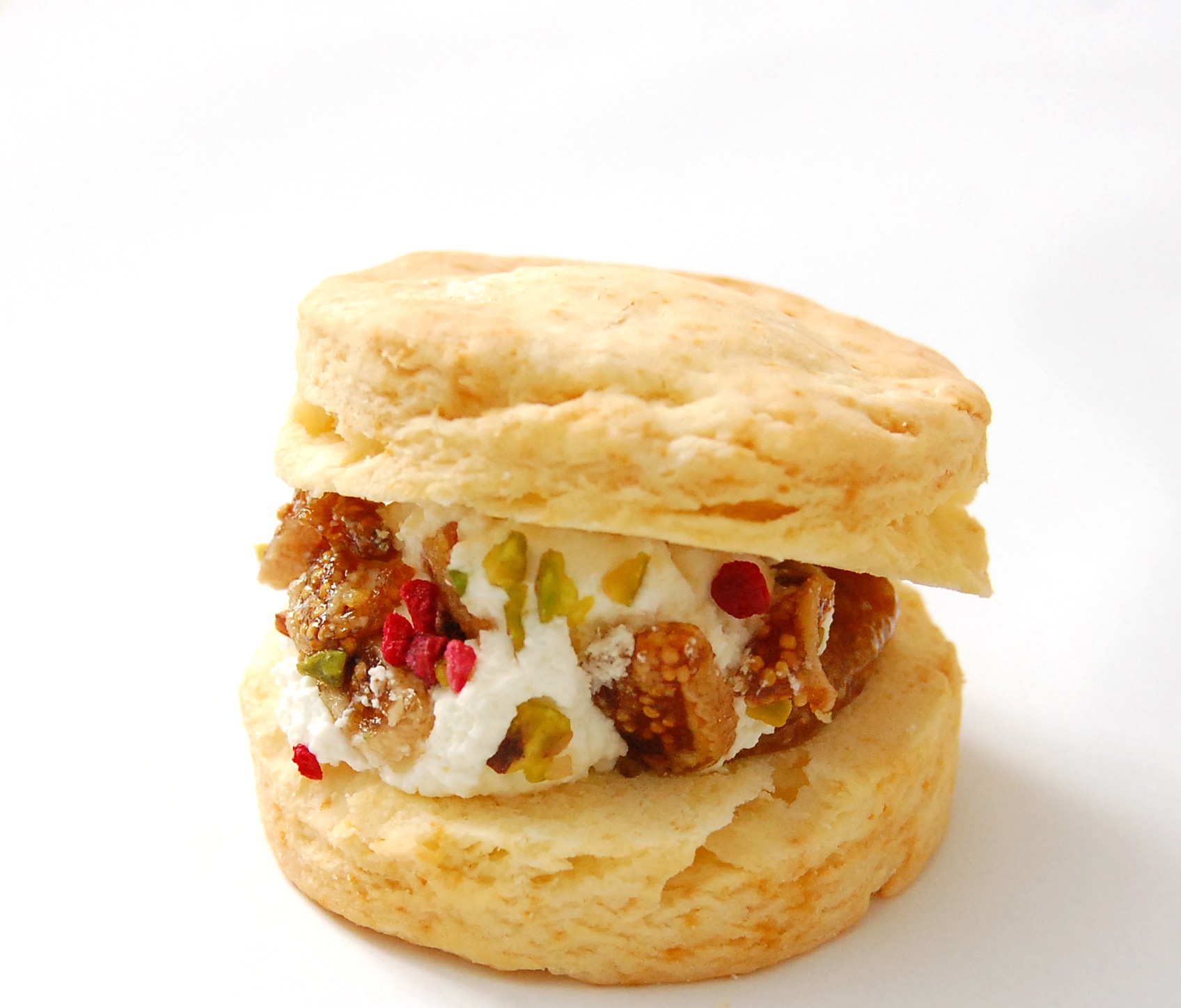百貨店のスコーン展でもご好評いただいた一品。しっとり焼き上げたスコーンに自家製スコーンクリームをいちじく・ピスタチオ・ラズベリーと合わせ、贅沢にサンド。ケーキのように楽しめる特別な味わいです。