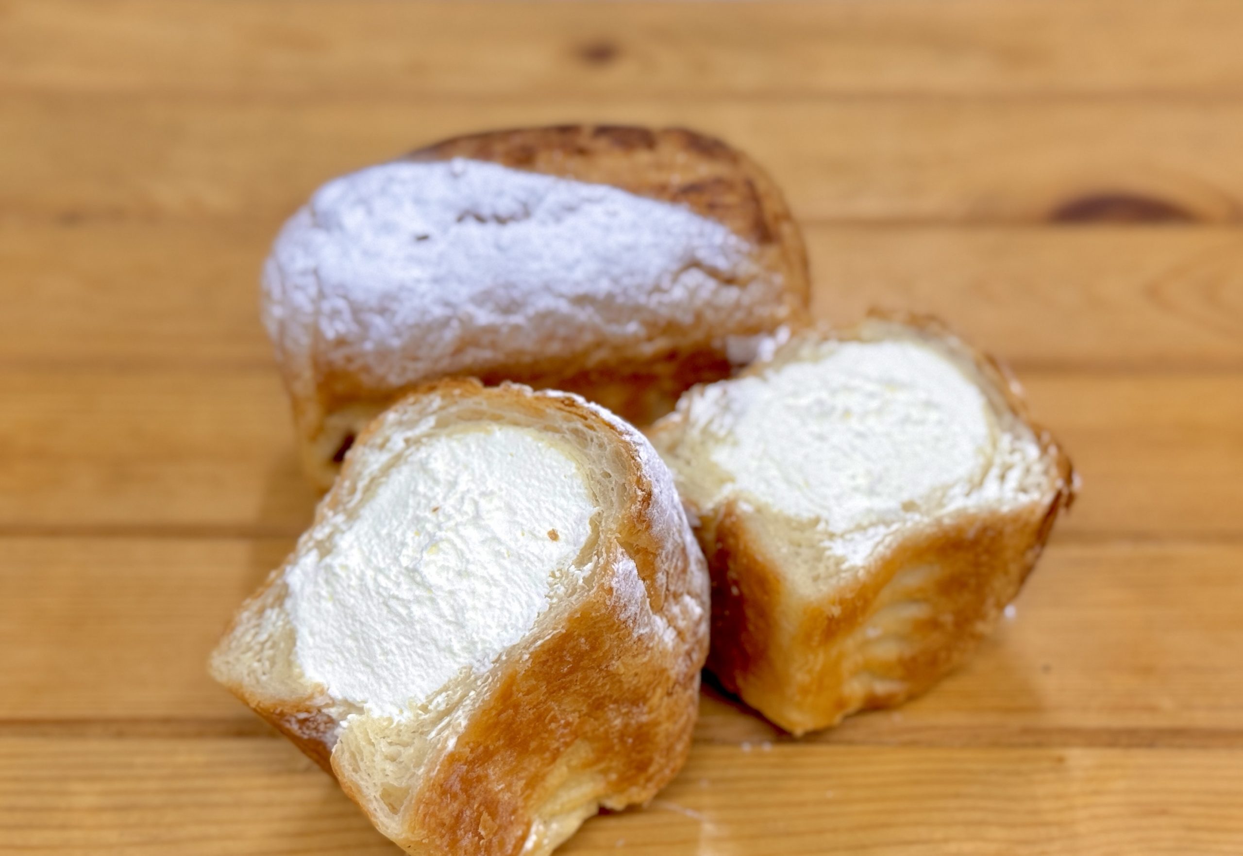 自家製バターを折り込んだクロワッサンみたいな塩パンに乳脂肪52%にして、自家製練乳を加えた生クリームをたっぷり詰め込みました。濃厚なのに爽やか、全くもたれない生クリームが塩パンの塩味と抜群に合います。