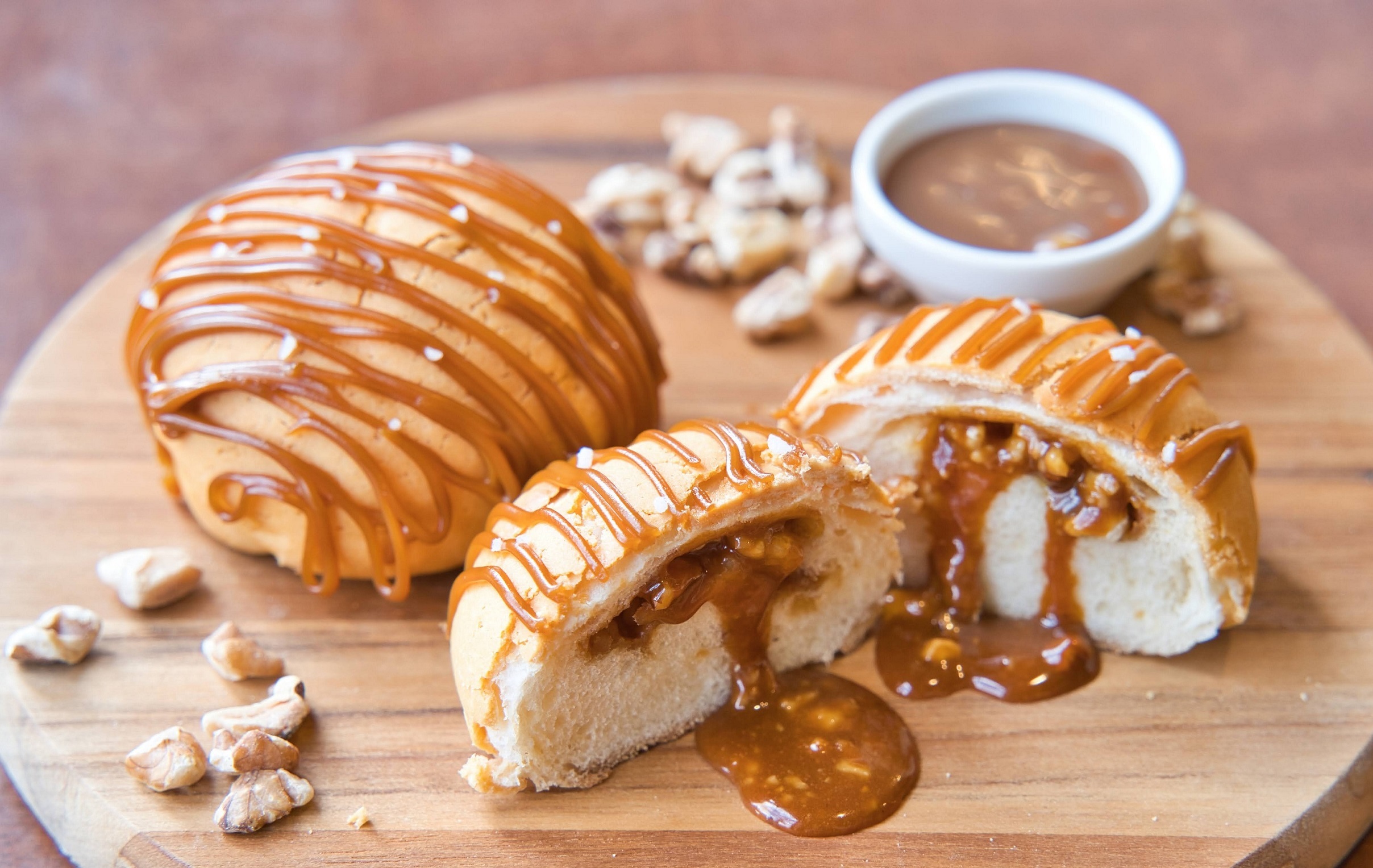 キャラメルソースを練りこんだ香ばしい張りのある生地で、チョコチップ、キャラメル、アーモンドを包み込みました。上にトッピングしたポピーシードとプレッツェルソルトのアクセントが甘みを引き立てます。