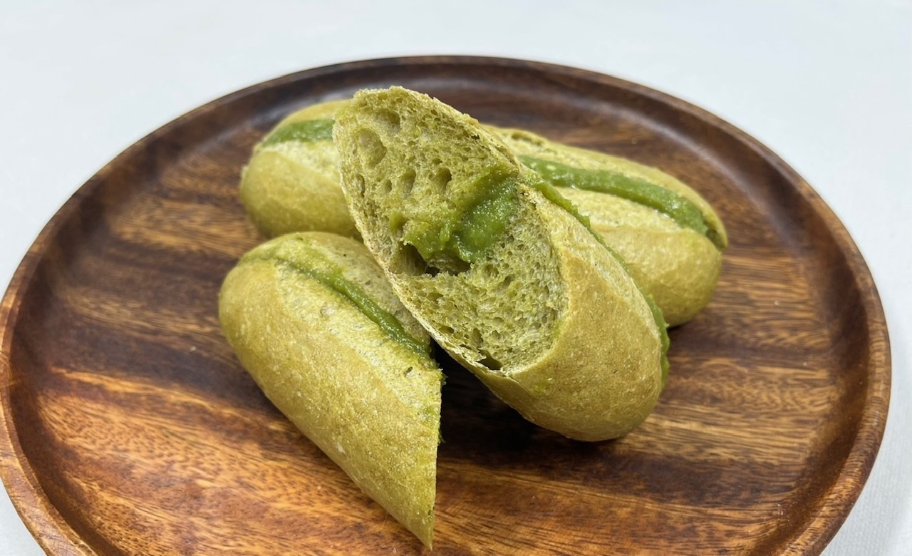 良縁を願う想いを込め、ミネラル30種類入りの仕込み水と天日塩・きび糖など自然素材で焼き上げたうぐいすパン。発酵の良い、しっとり生地に豆のやさしい甘みが広がる一品