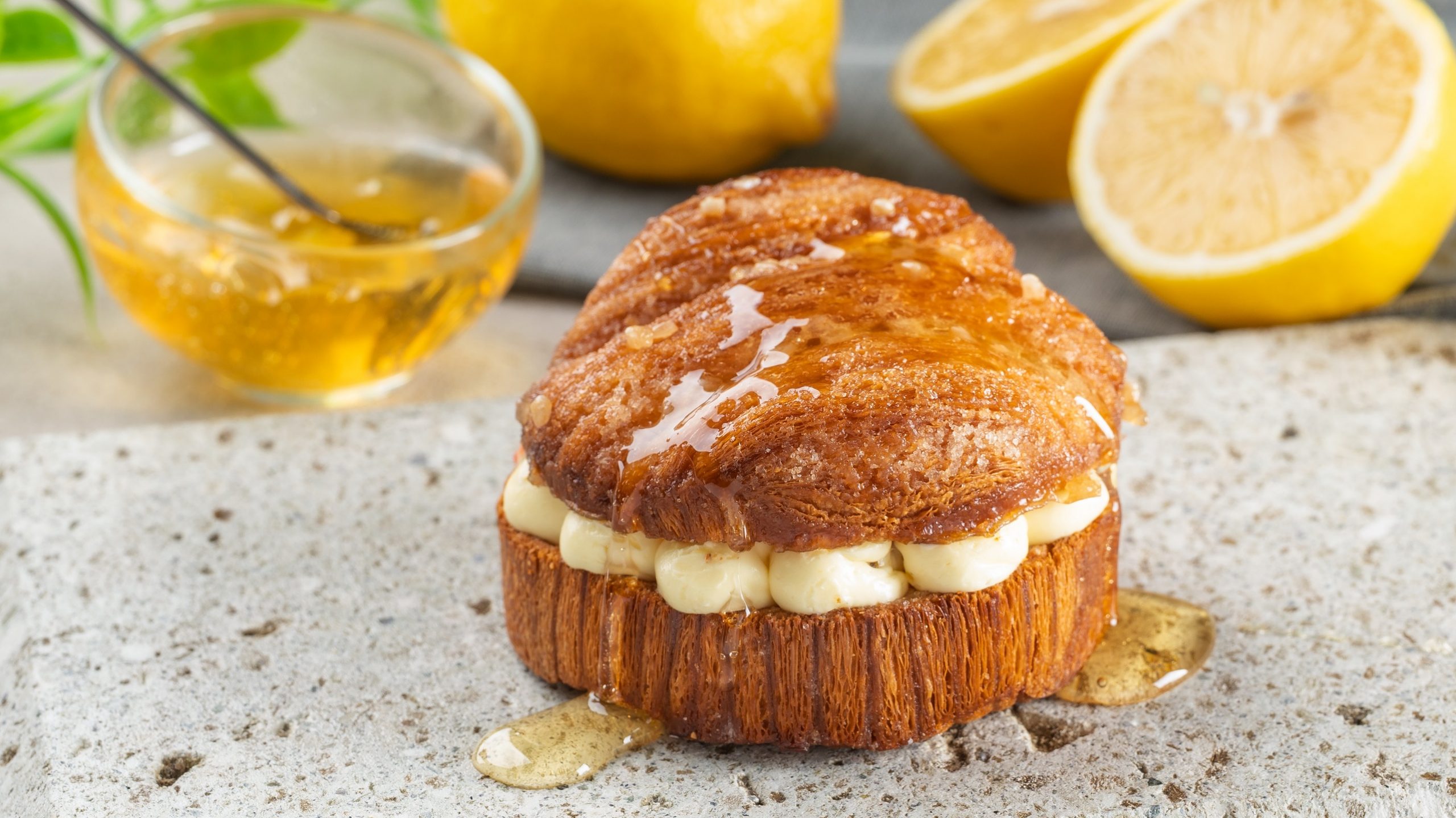 那須高原の山花から採れた「那須みつ」とバターに漬け込み焼き上げた甘い香りのクロワッサンに、酸味を効かせたレモンクリームをサンド。表面にはザラメをまぶし焼き上げたパン、ザクッと、カリっとした食感。仕上げにはレモンをゼストをあしらい爽やかなクロワッサンハニートーストに仕上げました。