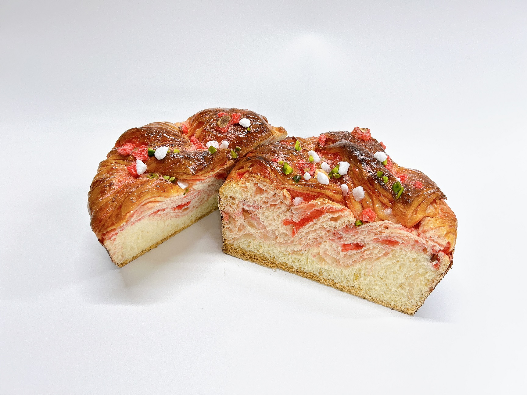 フランスのサヴォア地方にある村サン・ジュニの郷土菓子ブリオッシュ・ド・サンジュニ。コーナーポケットの製法でいちごミルクのパンにしました。いちごとミルクのペーストを折り込んだ生地でピンクのプラリネアーモンド巻き込み、しっとりふんわりと焼き上げています。いちごミルクの生地にカリッとプラリネアーモンドが香ばしく、切りくちのピンク色も可愛らしいパンです。