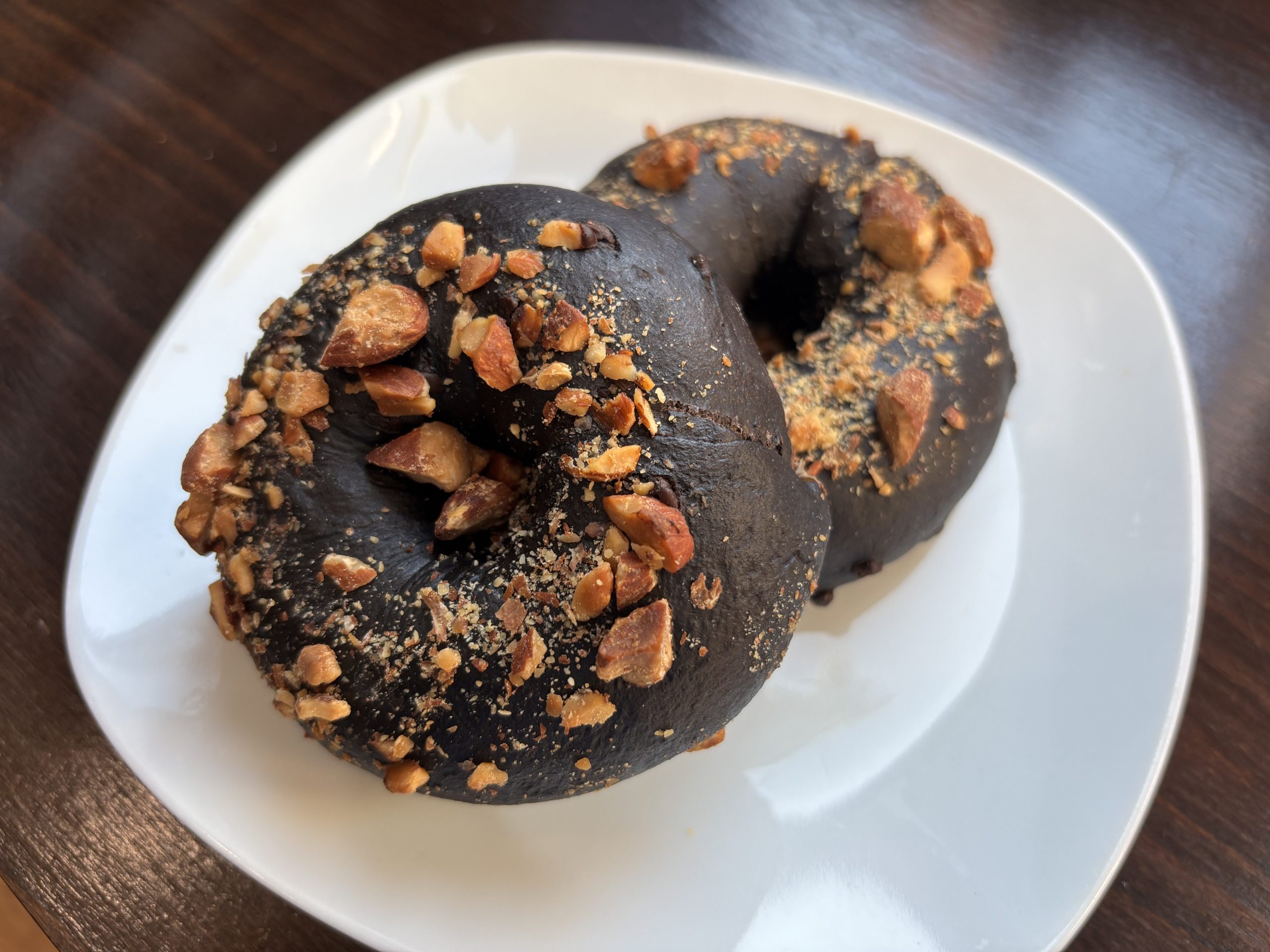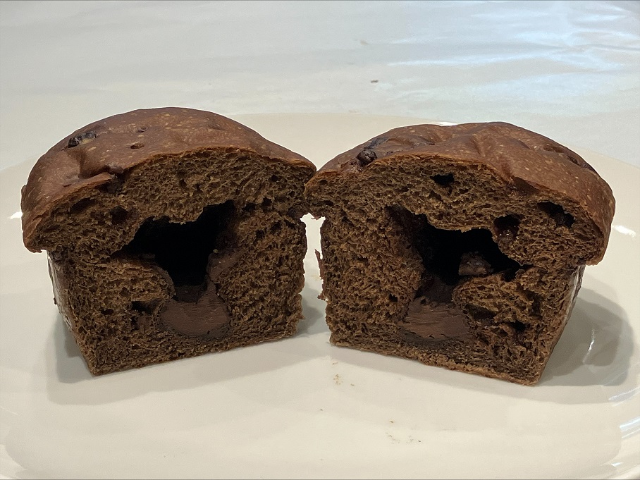 チョコ好きのためのチョコパンです。少し加熱すると、加水生地の中でチョコがトロリっとトロけます!