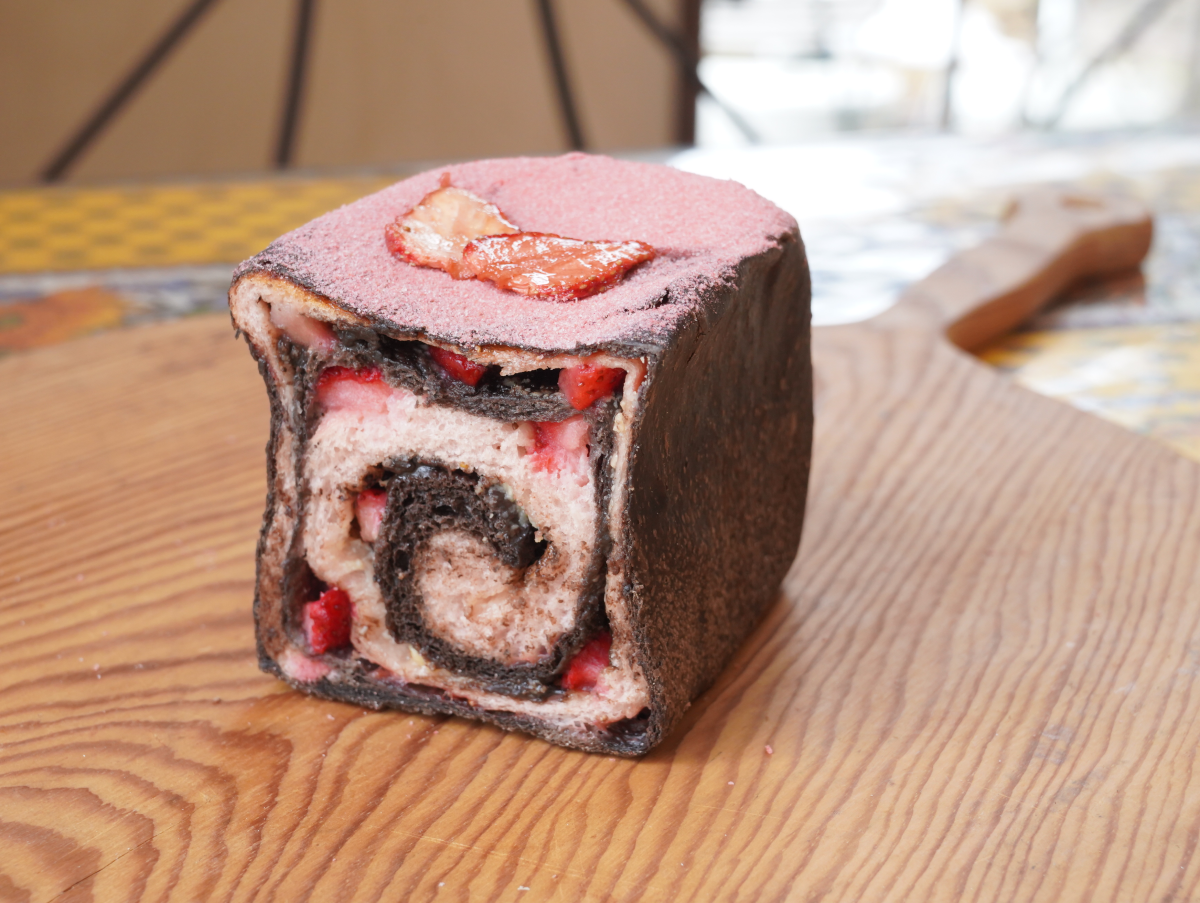 アワード金賞を受賞したとちおとめ生地とカカオの生地とのコラボレーション。中にとちおとめジャムやとちおとめ果肉を入れて渦上に仕上げました。カカオの甘さとイチゴの酸味のコラボレーション!
