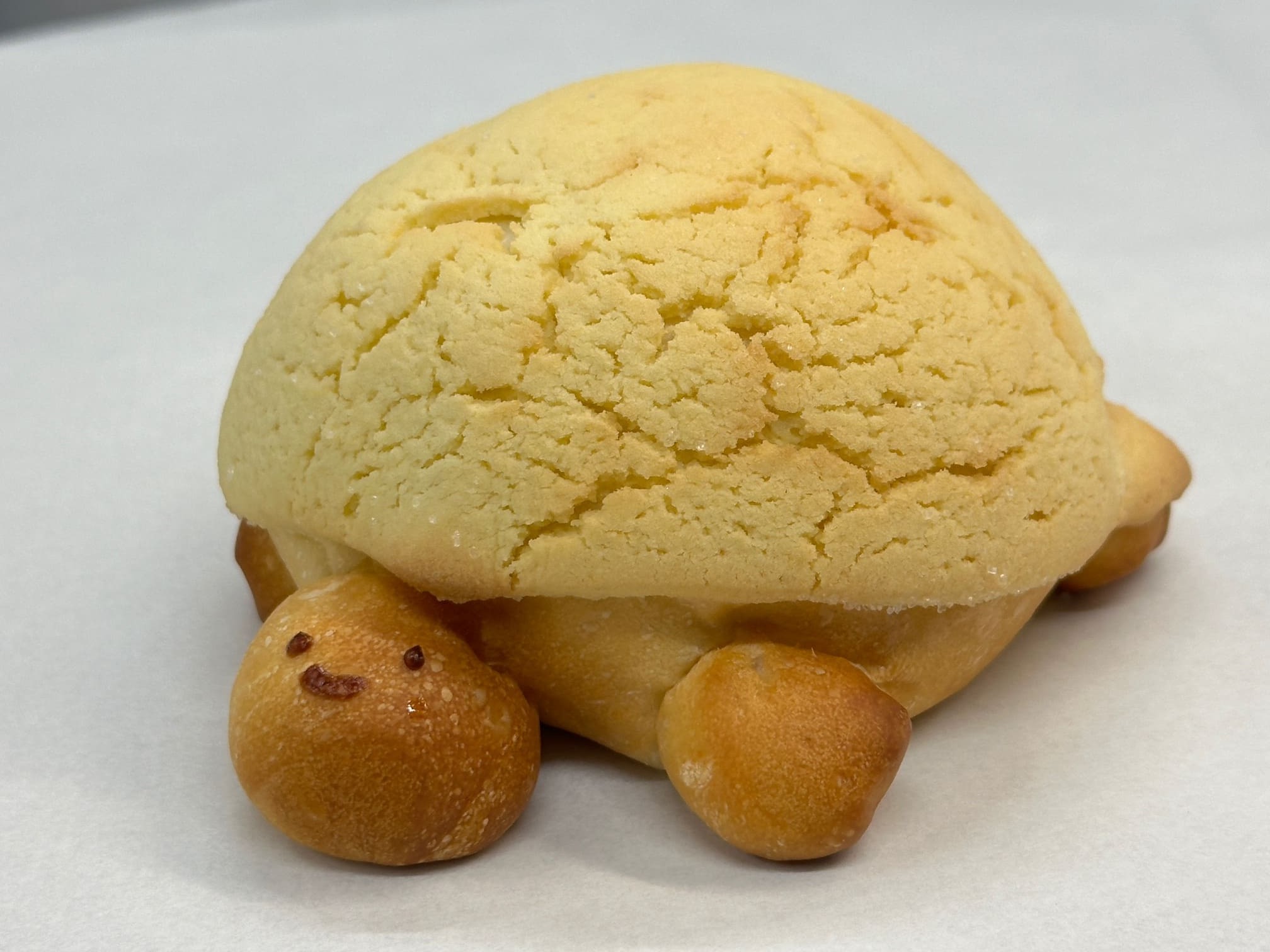 香ばしく焼き上げたマカロンメロンパンにたっぷりの生カスタードクリームを絞り込んだ究極のデザートパン!
