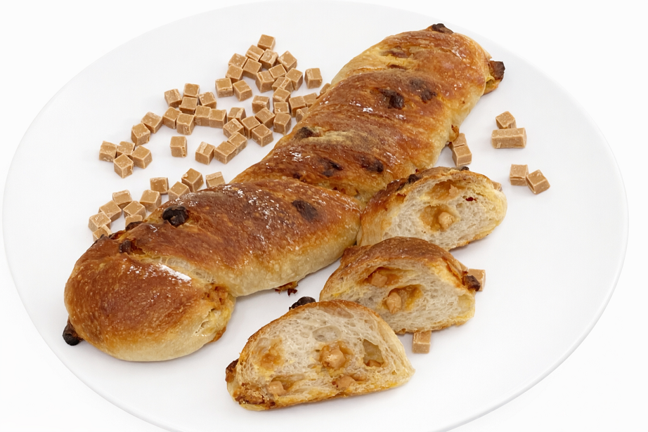 まるでリレーの時に用いる“バトン”のような形をしたパンです。当店ではバトンのシリーズが人気の為、いろいろな種類をご準備しております。バトンシリーズの中でも一番人気の、キャラメル!キャラメル!はスペシャルなフランスパン生地にキャラメルチョコレートをふんだんに入れました。食感はセミハードですが、小さなお子様からご年配の方まで愛されているパンです。