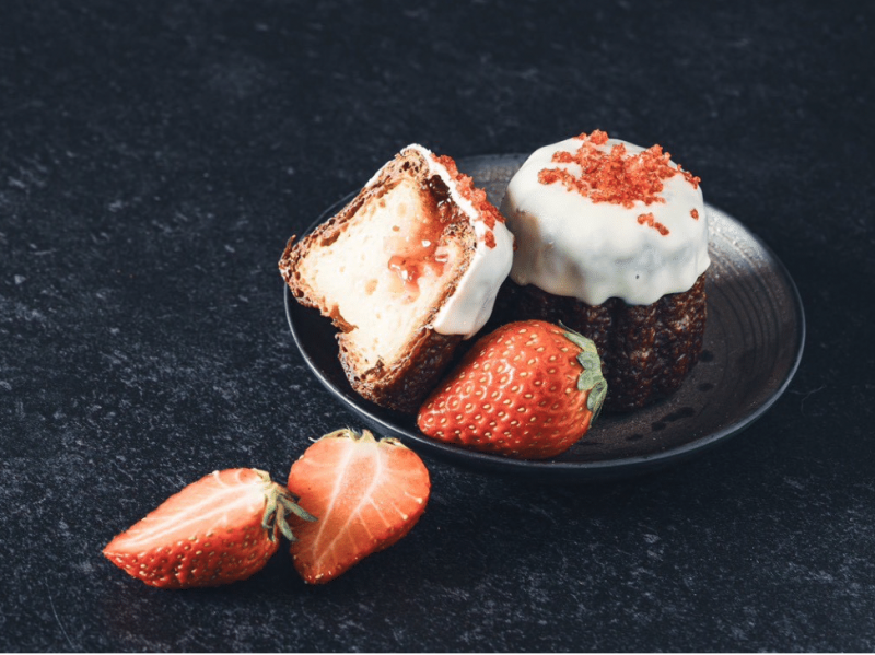 甘酸っぱいいちごと、なめらかなチーズケーキを丸ごと包み込んだ贅沢なベーグルです。もっちり生地とやさしいコクが広がる、デザート感覚の一品です。