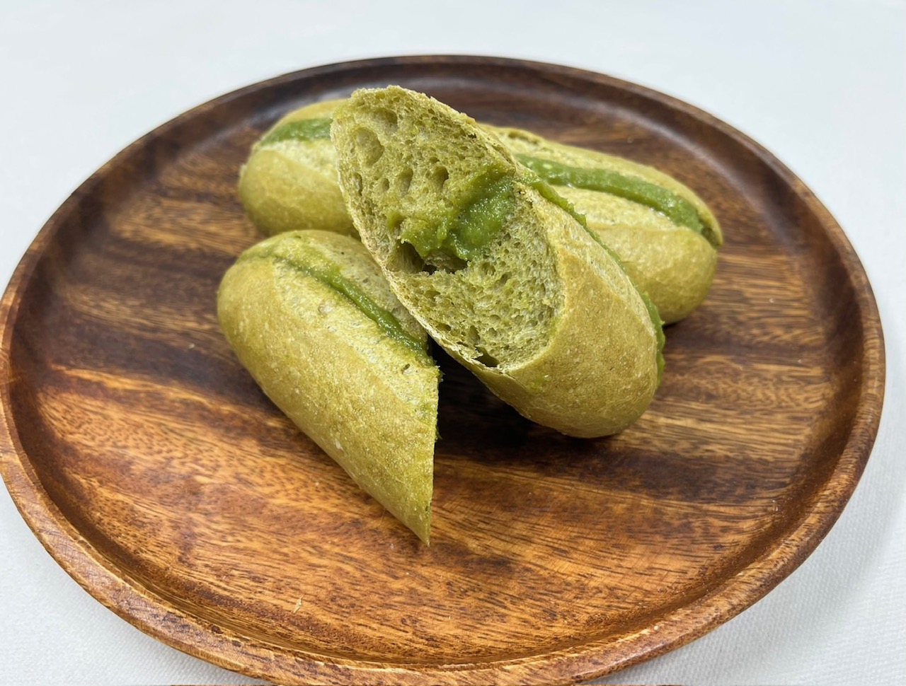 良縁を願う想いを込め、ミネラル30種類入りの仕込み水と天日塩・きび糖など自然素材で焼き上げたうぐいすパン。発酵の良い、しっとり生地に豆のやさしい甘みが広がる一品。